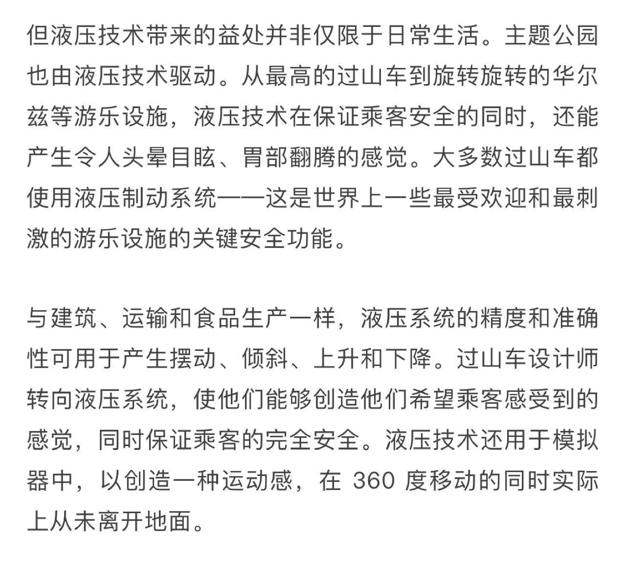 游樂園的游樂設(shè)施利用液壓缸和其他部件來輔助其各種動(dòng)作以及實(shí)現(xiàn)多種安全功能