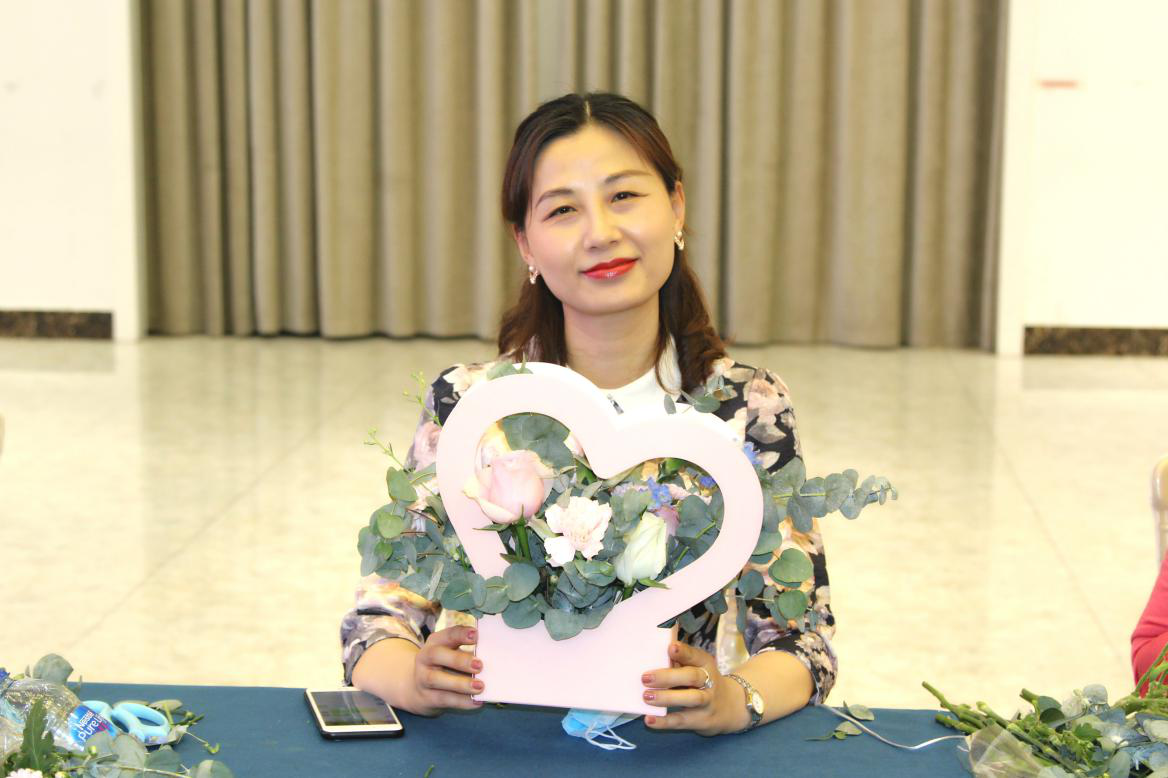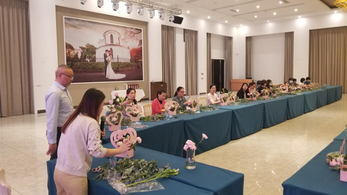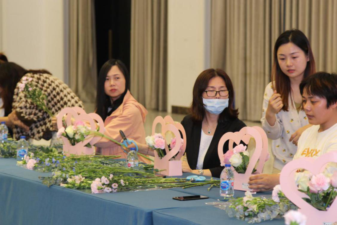 現(xiàn)場女同事們在花藝老師的指點下,正在饒有興致地制作花束。