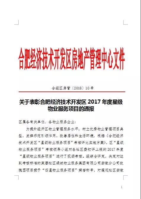 為提升物業(yè)管理服務(wù)水平,樹(shù)立優(yōu)秀物業(yè)管理項(xiàng)目典型,合肥市經(jīng)開(kāi)區(qū)管理委員會(huì)和經(jīng)開(kāi)區(qū)房地產(chǎn)管理中心聯(lián)合開(kāi)展合肥經(jīng)濟(jì)技術(shù)開(kāi)發(fā)區(qū)“星級(jí)物業(yè)服務(wù)項(xiàng)目”考核評(píng)比活動(dòng),根據(jù)考核評(píng)比實(shí)施方案,對(duì)通過(guò)初評(píng)的十個(gè)項(xiàng)目進(jìn)行現(xiàn)場(chǎng)考核,最終1家榮獲四星物業(yè)服務(wù)項(xiàng)目,6家榮獲三星物業(yè)服務(wù)項(xiàng)目。為打造行業(yè)標(biāo)桿,我公司一直將提升服務(wù)品質(zhì)作為工作重點(diǎn)。公司按照業(yè)戶比例,為業(yè)主配備專屬樓管員,提高了服務(wù)效率,同時(shí)提升了物業(yè)管理服務(wù)質(zhì)量。工程人員定期對(duì)園區(qū)設(shè)施設(shè)備及公共區(qū)域每日例行巡查,定期維護(hù)保養(yǎng),做到“急業(yè)主之急,解業(yè)主之難”。秩序員對(duì)小區(qū)進(jìn)行二十四小時(shí)不間斷的秩序維護(hù)、消防管控、交通車(chē)輛管理,為小區(qū)業(yè)主提供安全有序的居住環(huán)境。同時(shí)公司配備專業(yè)有素的保潔團(tuán)隊(duì),為了保證服務(wù)質(zhì)量,保潔員開(kāi)展互查自查樓宇,不放過(guò)每一個(gè)角落,確保保潔服務(wù)達(dá)到業(yè)主滿意,為業(yè)主帶來(lái)潔凈的居住環(huán)境。