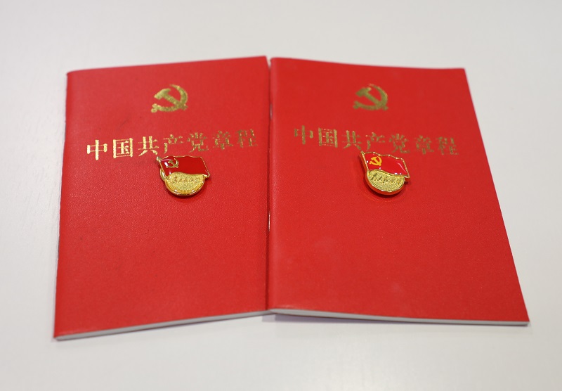 支部書記戴正春為兩名新發(fā)展黨員頒授黨章并佩戴黨徽。