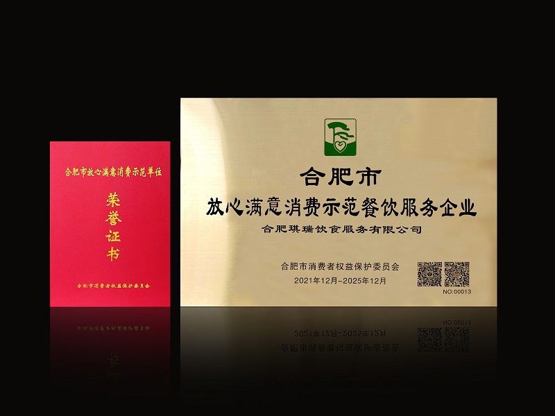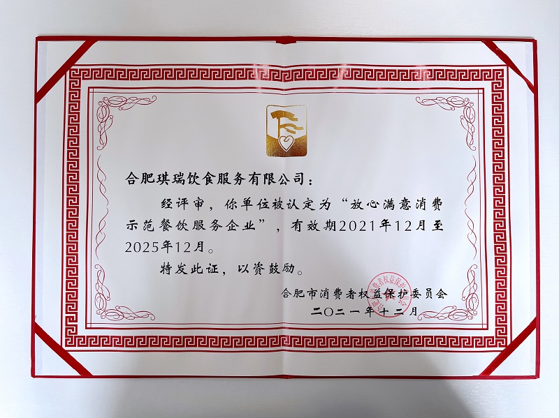 2022年3月15日,在合肥市消費(fèi)者權(quán)益保護(hù)委員會(huì)組織的“合肥市2021年放心滿意消費(fèi)示范單位評(píng)選”評(píng)選活動(dòng)中,合肥琪瑞飲食服務(wù)有限公司榮獲合肥市“放心滿意消費(fèi)示范餐飲服務(wù)企業(yè)”。