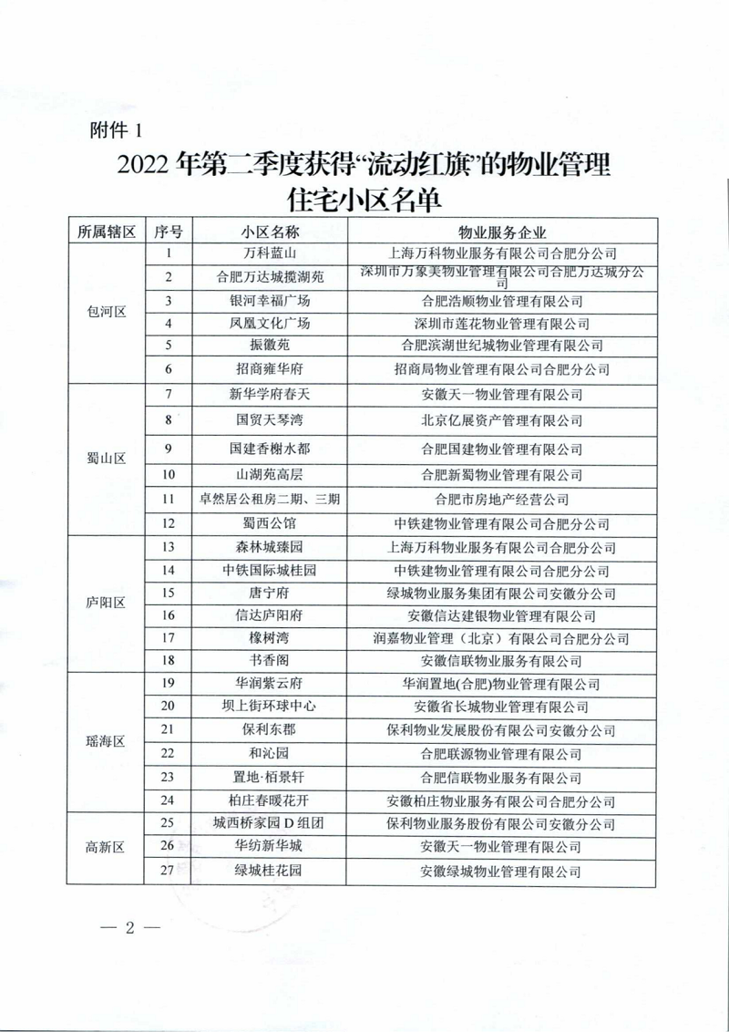 2022年7月29日,尚澤瑞康物業(yè)公司大都會(huì)、百樂門雙項(xiàng)目通過2022年第二季度物業(yè)服務(wù)綜合測評(píng),被授予合肥市物業(yè)管理住宅小區(qū)第二季度“流動(dòng)紅旗”。