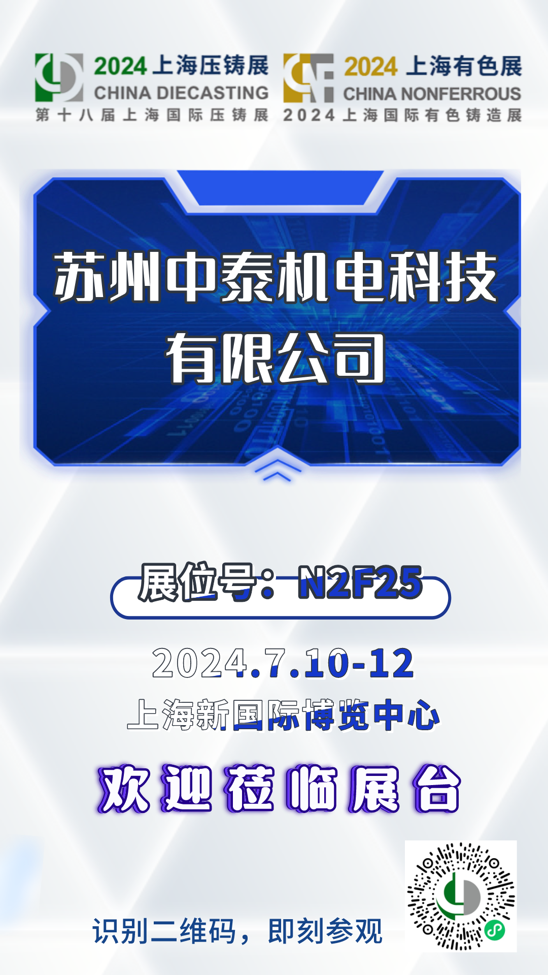 2024年7月10日 – 12日,第十八屆上海國際壓鑄暨有色鑄造展將在上海新國際博覽中心盛大開展,歡迎各位蒞臨蘇州中泰機電科技有限公司展臺參觀指導!