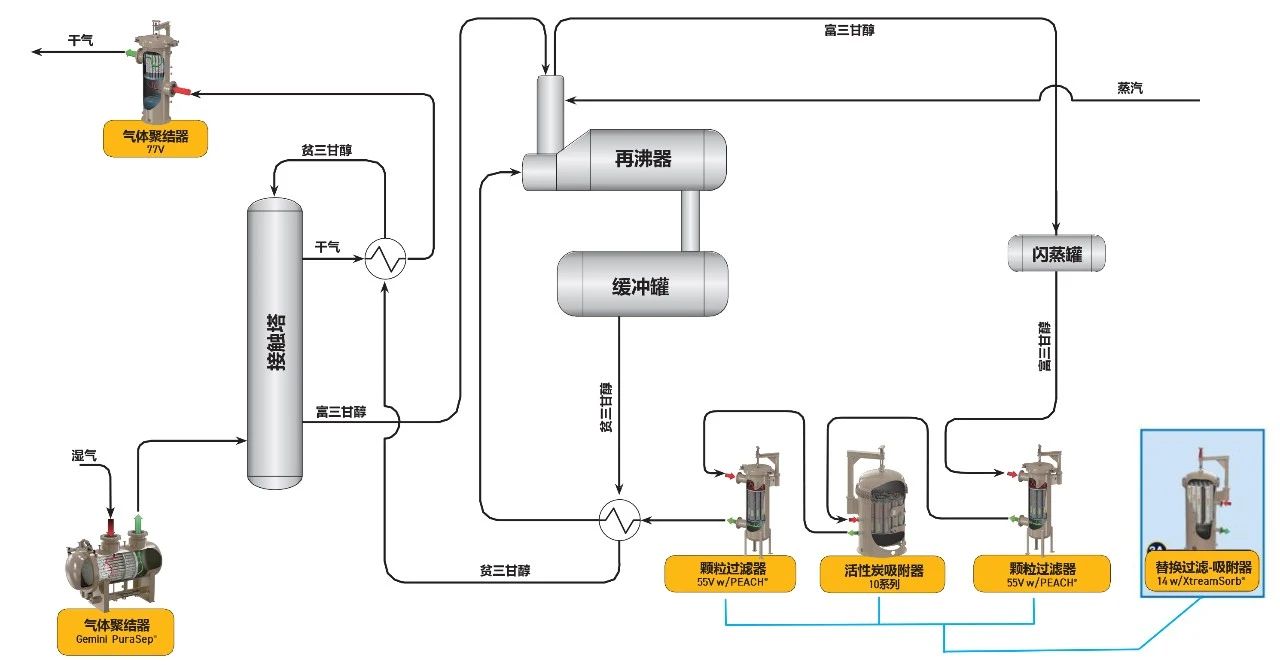 例如,天然氣中的冷凝液、鹽、顆粒等污染物可引起 TEG發(fā)泡,不僅導致氣體不合規(guī),含水量超標,露點升高,還會造成大量TEG夾帶;TEG再生回路的過量油液會在塔內沉積,導致再沸器對TEG的實際用量讀數不準;溶解在TEG液體中的鹽會加速火管腐蝕,導致火管故障;懸浮顆粒物含量超出再生標準時,會導致托盤和泵堵塞、過濾器使用壽命縮短等問題……可以說,過濾將對整個脫水工藝的性能將產生直接影響。