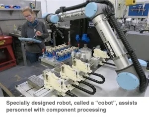 HSD使用簡單機器人協(xié)助工人工作(如負責加壓過程),把容易臟污、需要重復操作或有危險性的操作交由 “協(xié)作機器人”完成。自動化應用減少了枯燥的重復性運動,減少工人患上腕管炎或其他健康問題的風險。在自動化的輔助下,HSD向著零事故和零缺陷的安全目標更進一步。