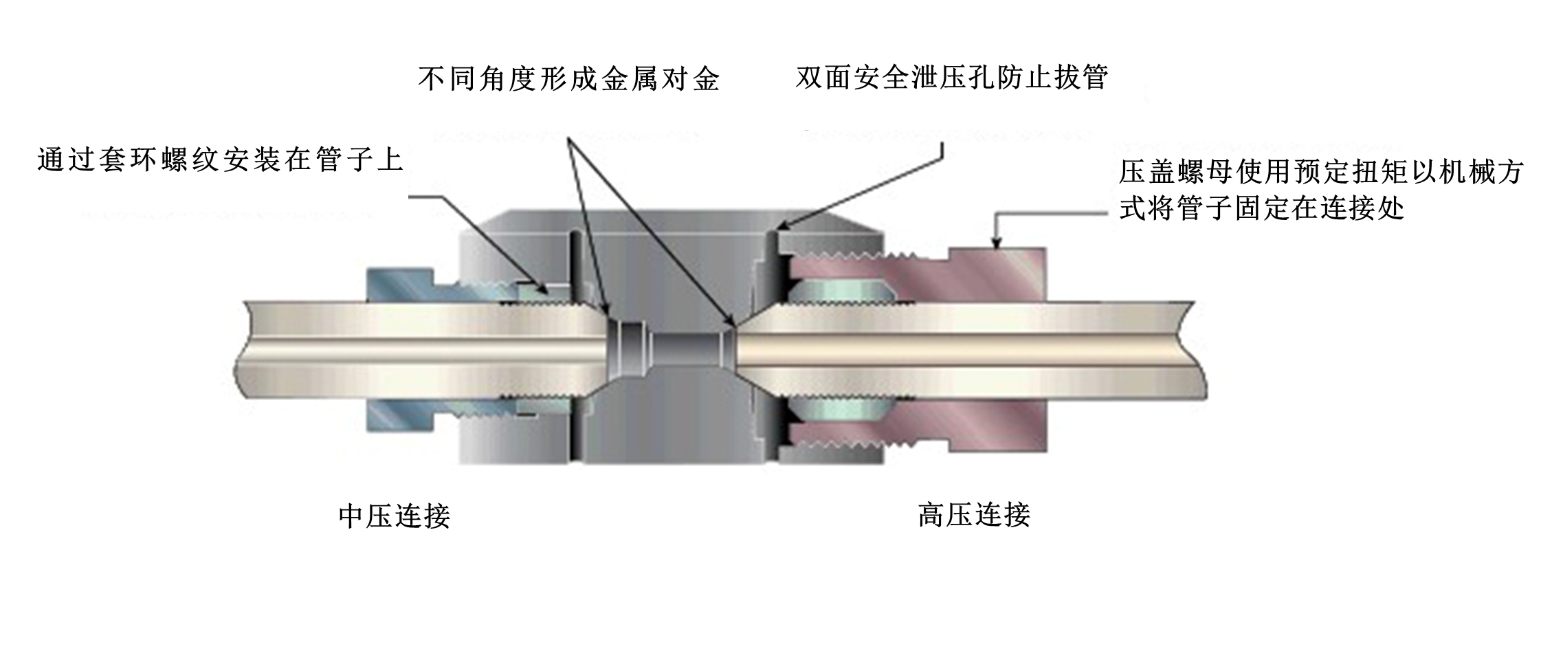 如果使用高壓工具加工中壓管,則會(huì)將壁厚降低到安全限值以下,并可能導(dǎo)致災(zāi)難性故障。同樣,將高壓接頭與中壓管組合使用,則意味著公接頭和母接頭將無法正確安裝。可能螺紋看起來是匹配的,但壓蓋螺母不會(huì)嚙合到系統(tǒng)保持安全所需的深度。高壓和中壓接頭中所用金屬的機(jī)械性能差異很大,所以中壓裝置無法承受高壓應(yīng)用條件。